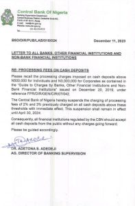 The Central Bank of Nigeria (CBN) has suspended charges on cash deposits for individuals and corporate organisations with immediate effect till April 30, 2024.