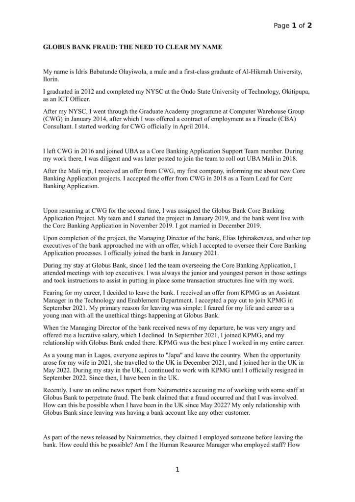 He described as false, online reports accusing him of working with some staff at Globus Bank to perpetrate fraud. “The bank claimed that a fraud occurred and that I was involved. How can this be possible when I have been in the UK since May 2022? My only relationship with Globus Bank since leaving was having a bank account like any other customer.”