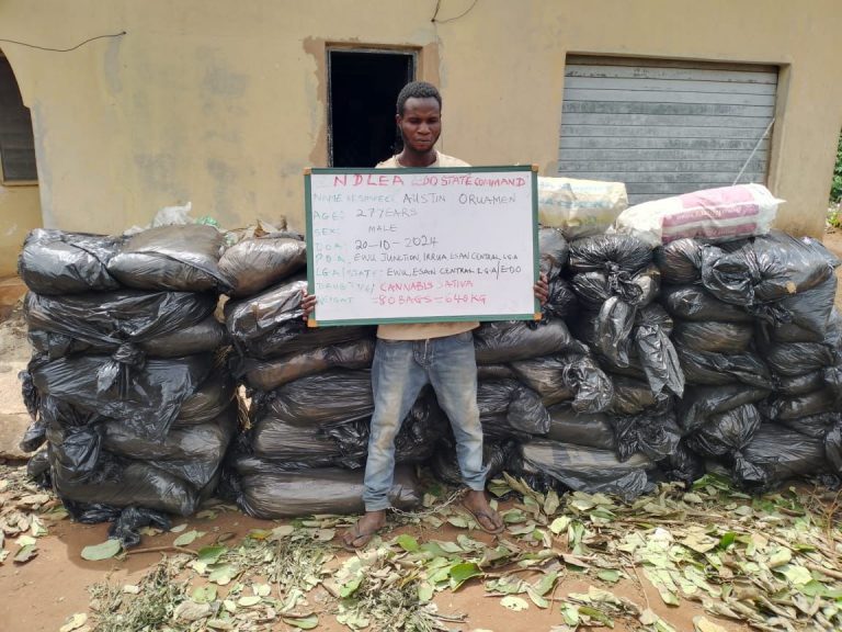 “In Edo State, NDLEA operatives recovered 640 kg of cannabis concealed in 80 jumbo bags of fresh vegetables at Ewu Junction, Irrua, Esan Central LGA, and arrested a suspect, Austin Oruamen, 27, while another suspect, Adereti Kazeem, 35, was arrested with 200 blocks of cannabis weighing 133 kg at Obalayan, Ile-Ife, Osun State, on Thursday, 24th October,” the statement added.