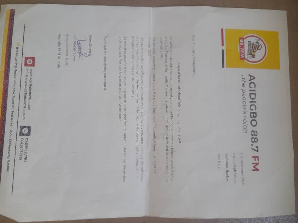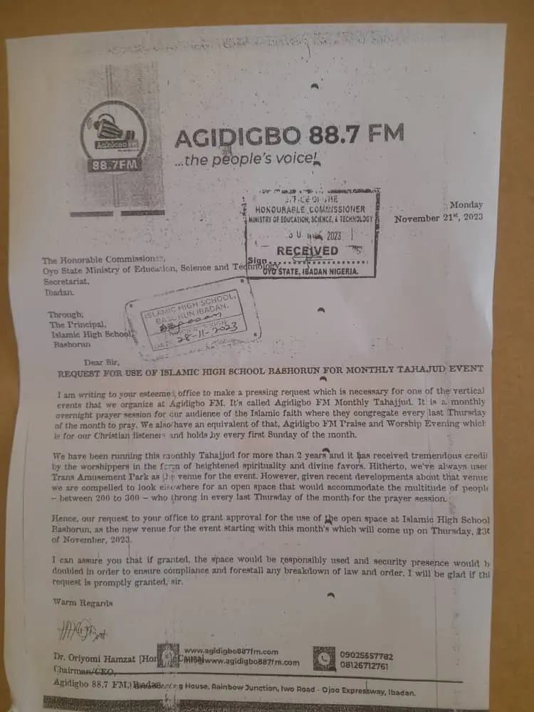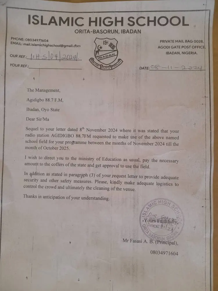 Islamic High School Old Students Association has declared that it was the Oyo State government through the ministry of education that granted Agidigbo FM the approval to use the school field, not the principal.