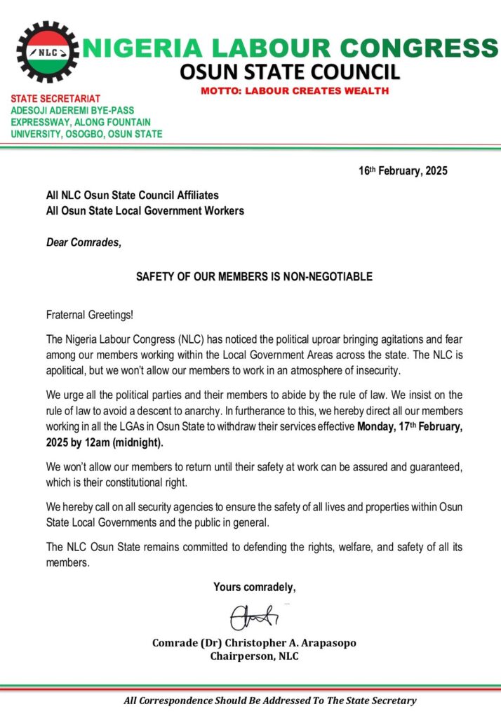 The Osun state Chapter of Nigeria Labour Congress has ordered all local governments workers in the state to withdraw their service drom Monday 17th, February 2025 until further notice.