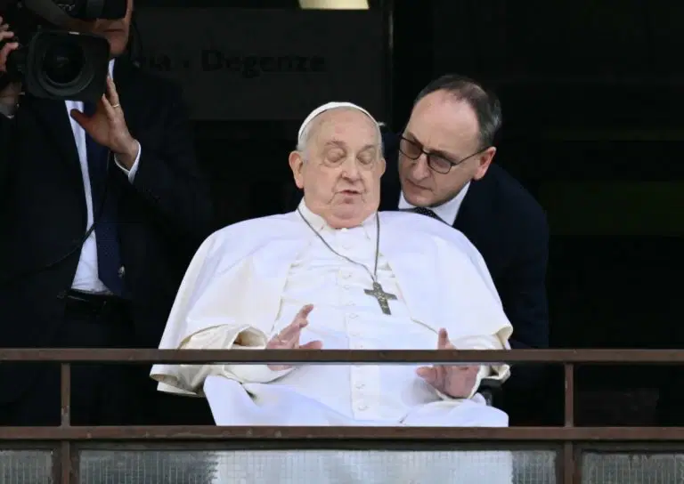 Pope Francis greeted and thanked the faithful from a balcony of Rome’s Gemelli hospital Sunday, the first time the 88-year-old has been seen in public since his admission on February 14.