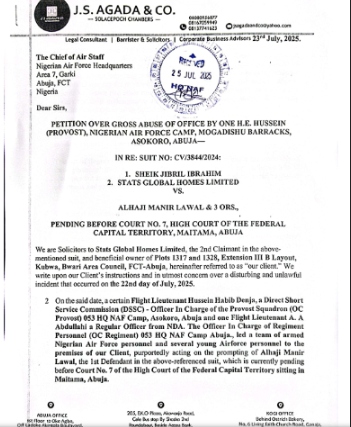In the petition received by the office of the Chief of Air Staff on July 25, the said Flight Lieutenant Hussein was alleged to have taken sides with Alhaji Manir Lawal with the arrest of his clients’ workers twice and taken them to unlawful custody.