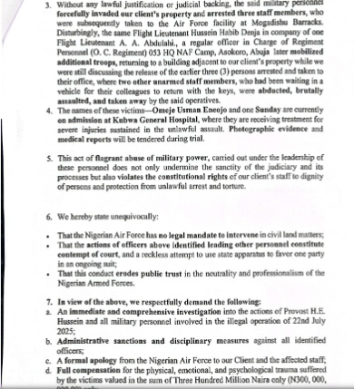 “On the said date, a certain Flight Lieutenant Hussein Habib Denja, a Direct Short Service Commission (DSSC) – Officer In Charge of the Provost Squadron (OC Provost) 053 HQ NAF Camp, Asokoro, Abuja and one Flight Lieutenant A. A Abdullahi a Regular Officer from NDA. The Officer In Charge of Regiment Personnel (OC Regiment) 053 HQ NAF Camp Abuja, led a team of armed Nigerian Air Force personnel and several young Airforce personnel to the premises of our Client, purportedly acting on the prompting of Alhaji Manir Lawal, the Ist Defendant in the above-referenced suit, which is currently pending before Court No. 7 of the High Court of the Federal Capital Territory sitting in Maitama, Abuja.